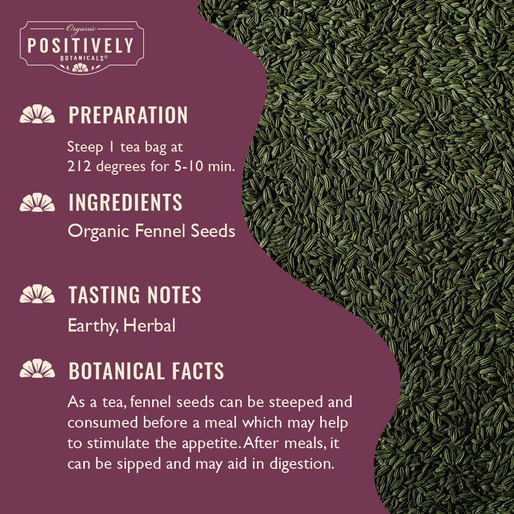 Fennel has been widely used for healthy digestion and was traditionally used to treat gas and bloating due to its carminative nature. Fennel is also a vegetable, and is regularly consumed in aromatic Mediterranean dishes. Its mildly sweet flavor is reminiscent of licorice or anise. As a tea, fennel seeds can be steeped and consumed before a meal which may help to stimulate the appetite. After meals, it can be sipped and may aid in digestion.